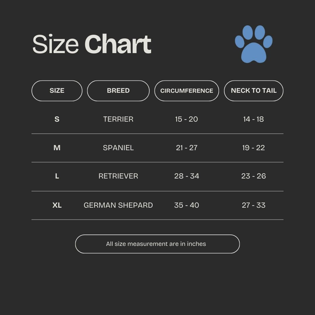 Use the chart below or click here to find the perfect fit for your pup. Ensure you measure both chest circumference and neck-to-tail length for the best results.